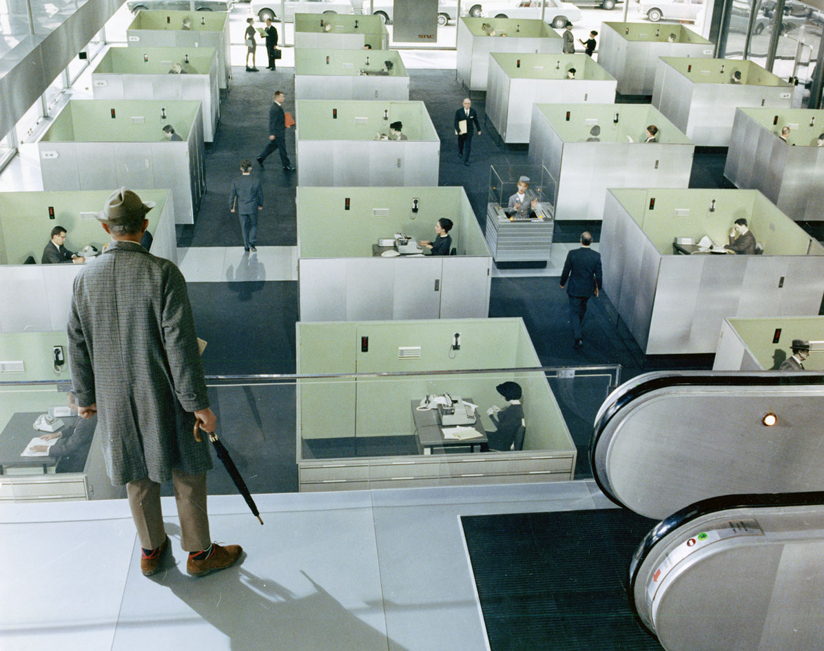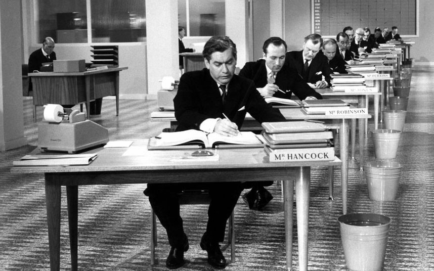 Offices. In cinema they tend to be private places where power is exercised on the unfortunate. Or, they’re grim, formal prisons where the schmuck, the schnook, the schmo, is locked in spiritual chains, his individuality sublimated by the will of the mighty employer. In the office, he becomes just another brick in the wall. Offices in cinema then, rarely bode well for the little man.
